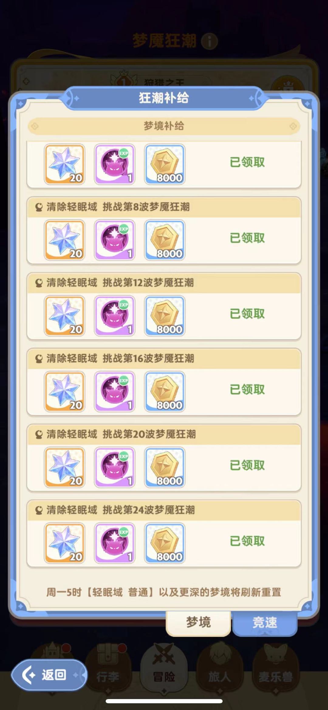- 每周梦魇,1500友情币,手册每周任务,星辰每周任务,秘境补给商店,旅团商店
