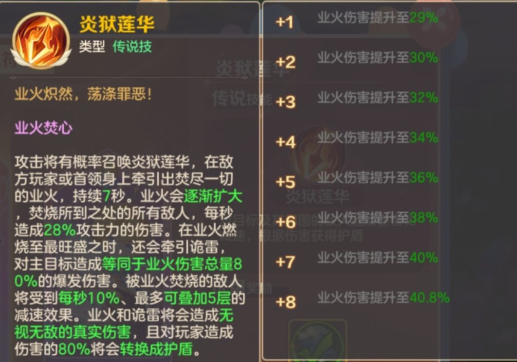 其中业火焚烧的对手受到减速效果,并且业火和诡雷可以造成无视无敌的真伤,且对玩家造成伤害的80%将会转化成护盾。