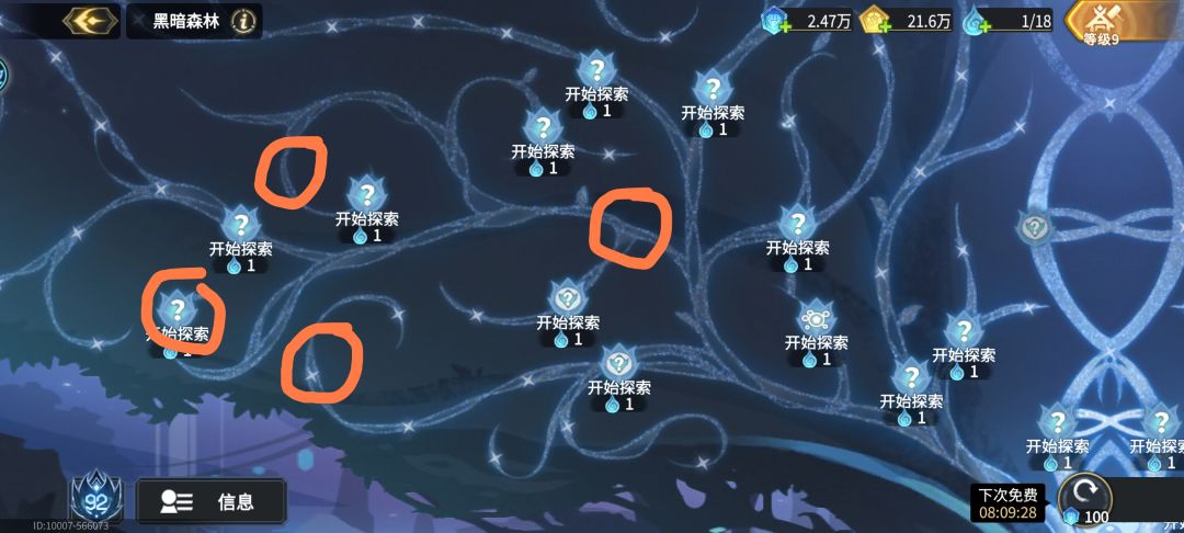 黑暗森林:建议每周至少购买1-4次,有能力的买满,这也是是后期拉开差距的主要培养点之一。每次刷新后首先看左下角信息有没有森灯,没有就继续等免费刷新。有的话看凶兽比例,10%以上就还可以,然后找到森灯,显示所有凶兽。森灯刷新点如下图,可能同时存在多个森灯。打完比较近的凶兽后,可以顺便捡光已经刷出来的孢子,也可以直接刷新,因为森林主要目的是获取漆黑源,因此不用专门去拿终焉之果或者孢子,不划算。