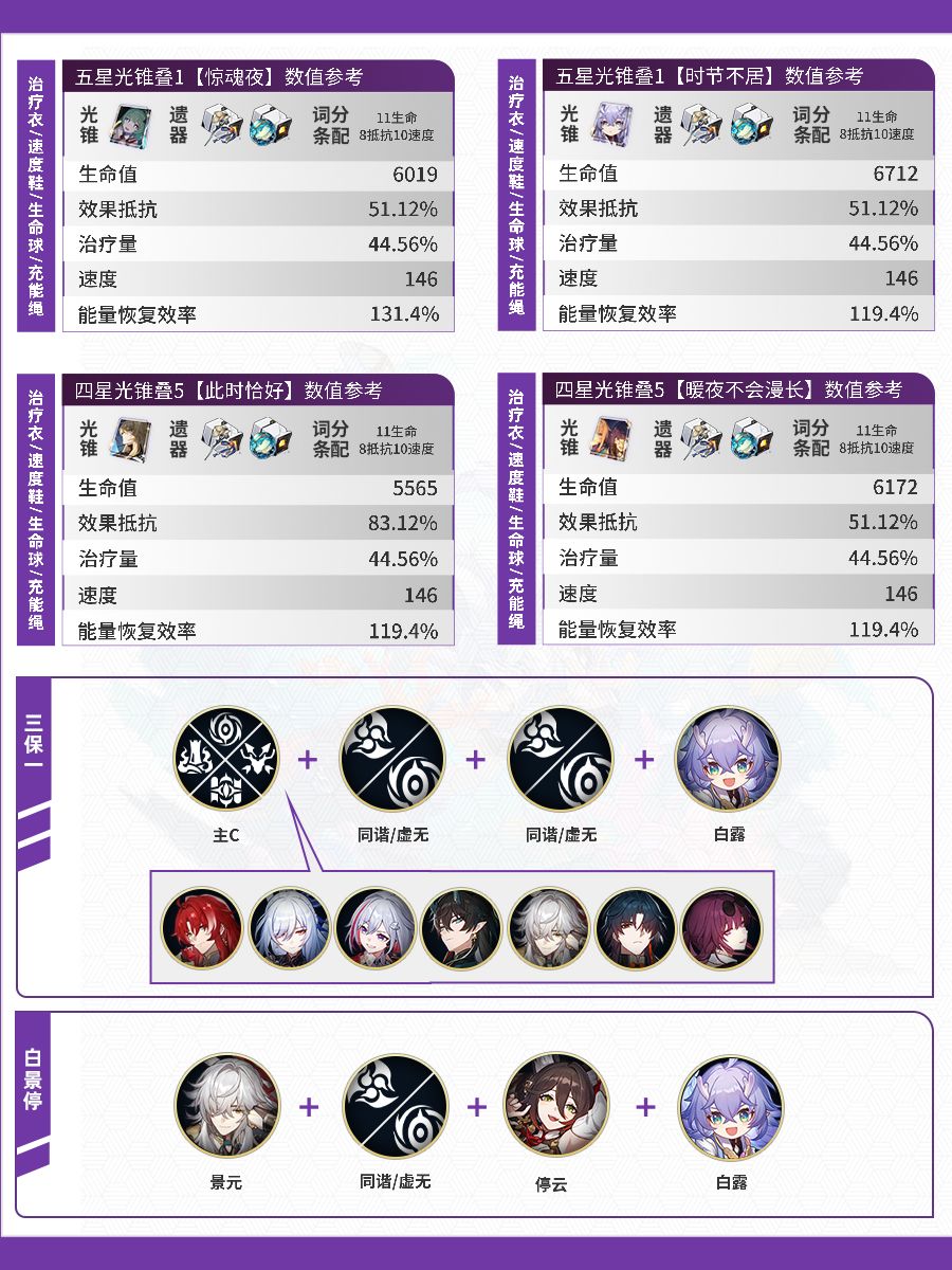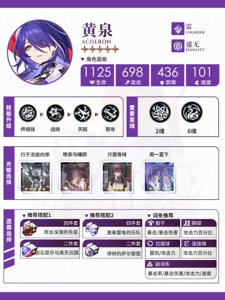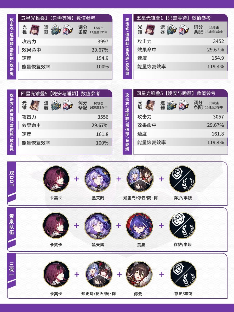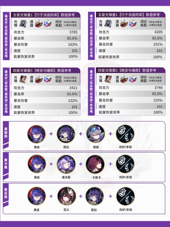 这一期是雷属性的四位角色:黄泉、白露、景元、卡芙卡一图流。