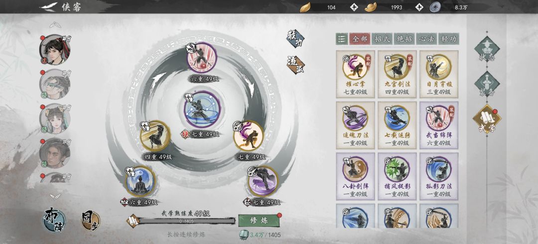 其中核心功法为:武当绵掌、摧心掌、七星剑阵、八步赶蝉