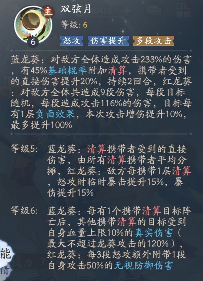 等级6:蓝龙葵:每有 1 个携带清算目标阵亡后,其他携带清算的目标受到自身血量上限 10 %的真实伤害(最大不超过龙葵攻击的 120 %),
