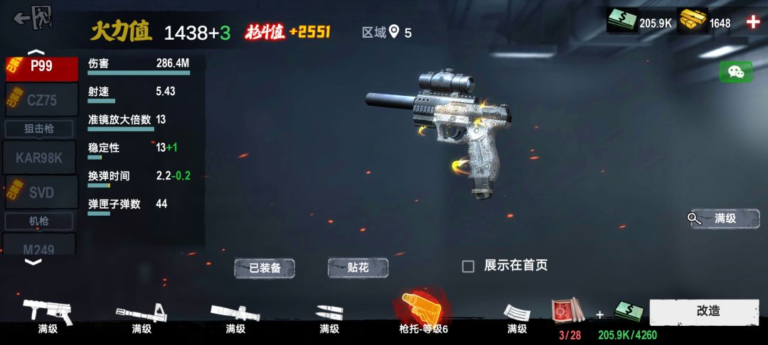 枪械每个部位都可以用钞票(资料片的枪要用金条)升级,部位升级到6级。