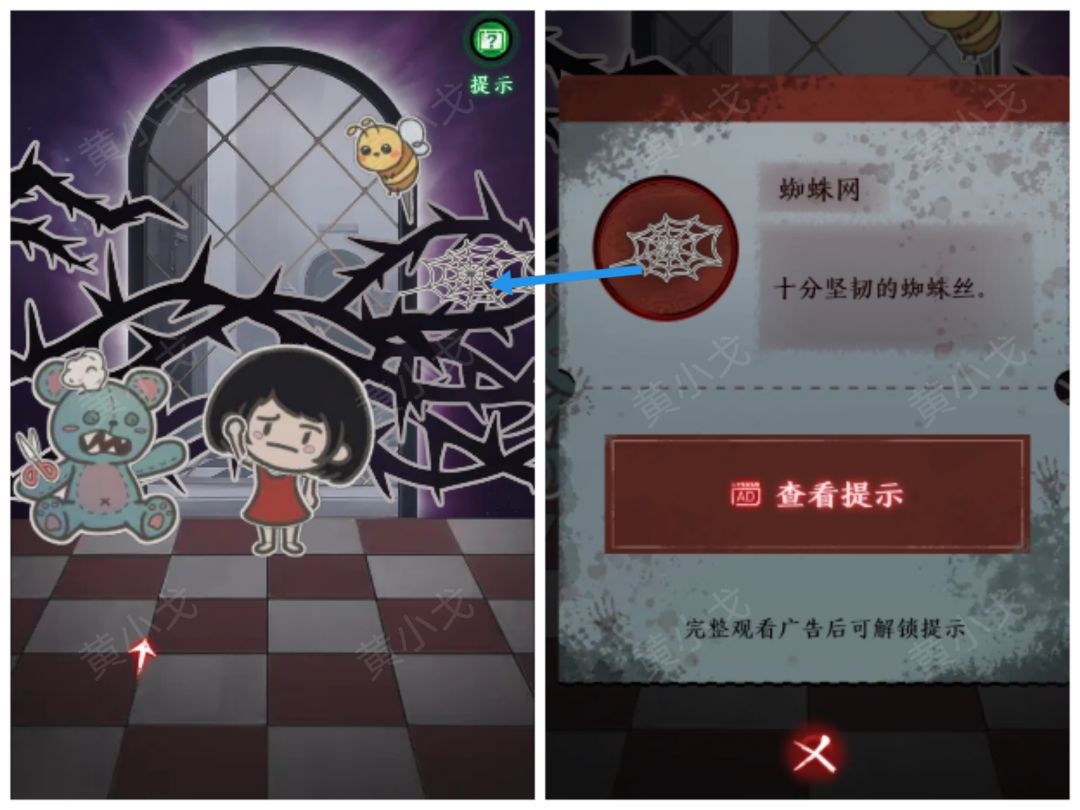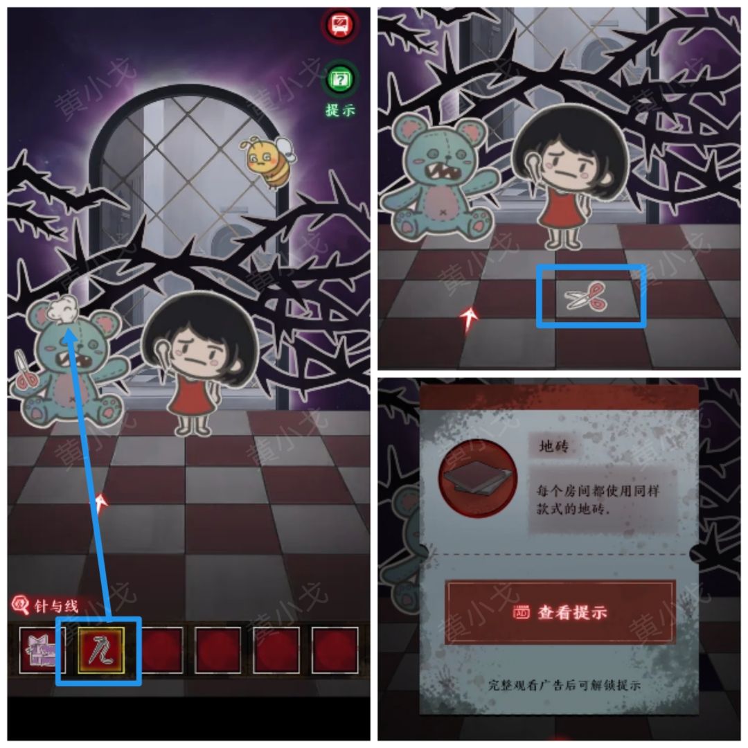 4.用【针与线】把小熊缝好,剪刀掉落;点击剪刀,触发剧情,获得【地砖】