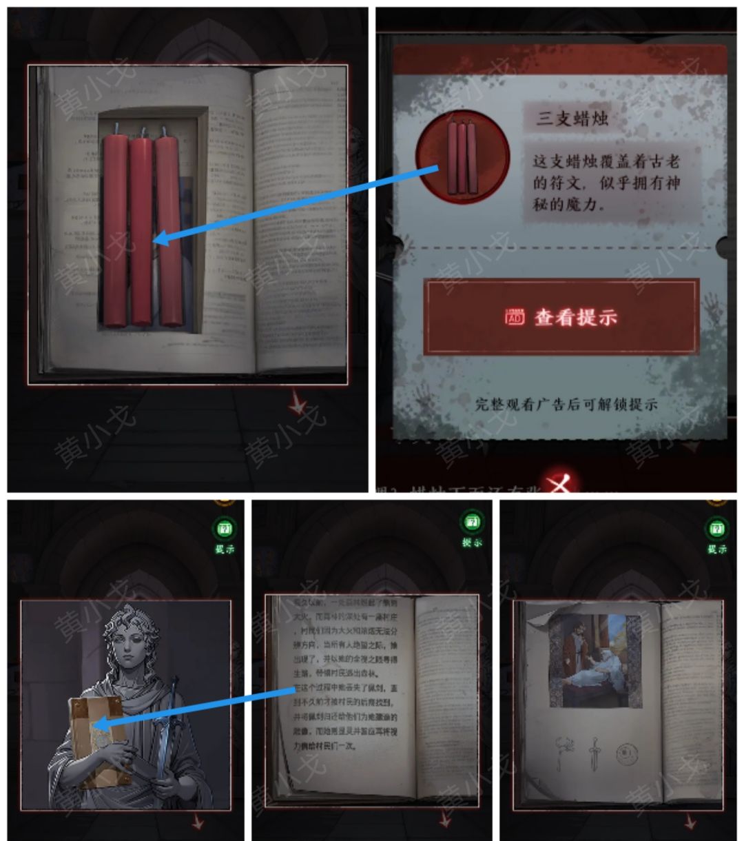13.点击雕像手中的书,翻开,获得【三支蜡烛】