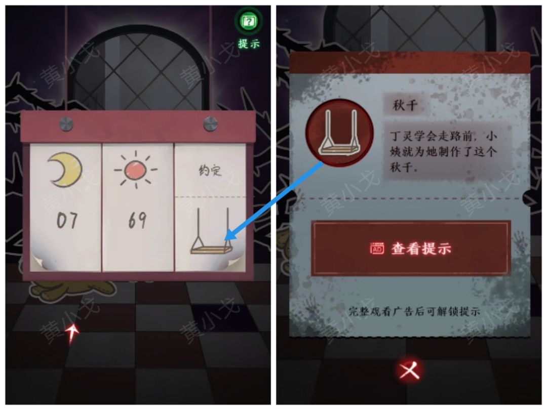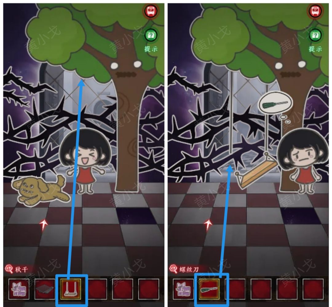 8.把【秋千】挂到树上;用【螺丝刀】修好秋千,触发剧情,获得【地砖】