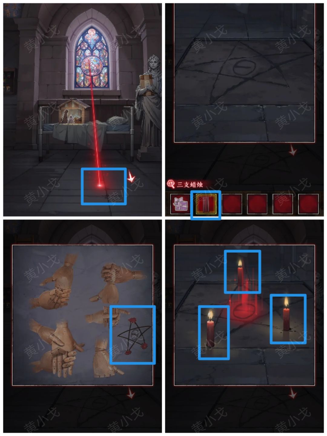 17.点击激光射到的地板砖,根据画上的线索,把【三支蜡烛】放到正确的位置上