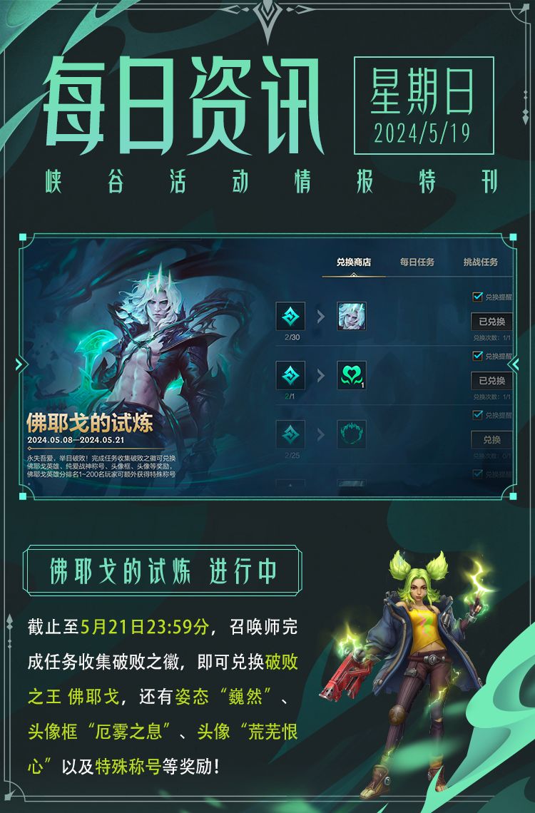 龙魂试炼第三阶段正在进行中!截止至5月28日23:59分,召唤师完成任务获取龙魂能量,即可抽取活动奖励,就有宗师级钓鱼训练师 贾克斯、龙魂水晶*3000和专属大奖随心三选一!奖励不会重复获得,参与9次可获得全部奖励噢~