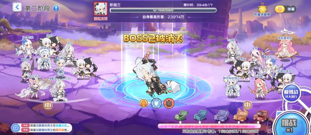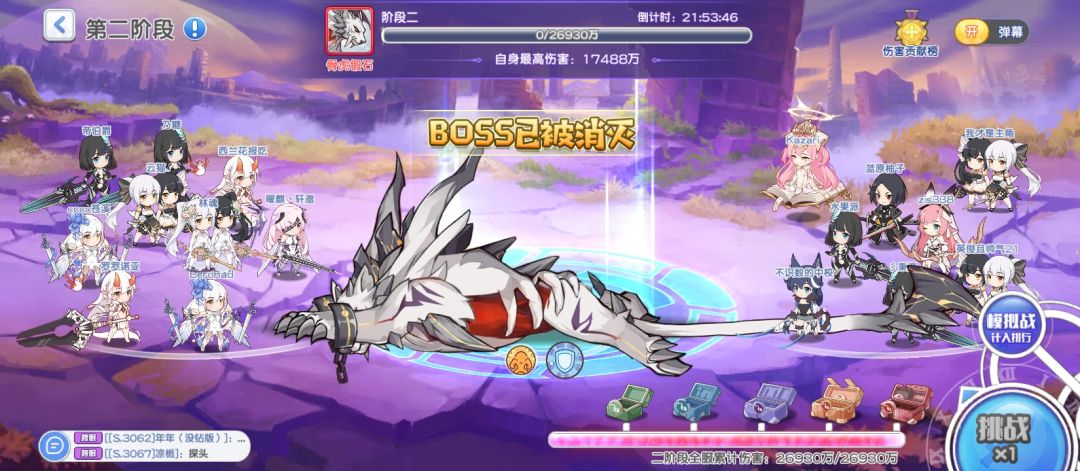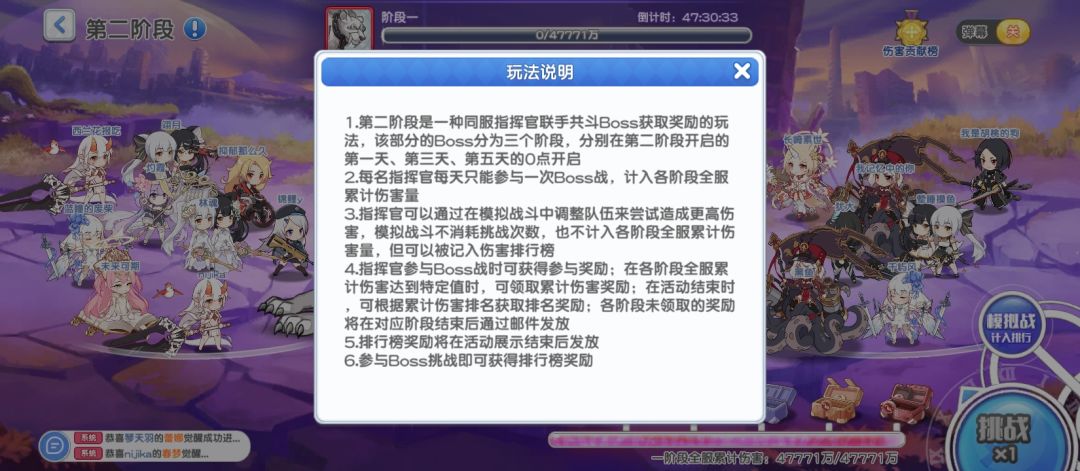 不用担心起来玩没有挑战机会拿不到奖励,按照秒速「模拟战」也是计入排行榜的,阶段宝箱是全服伤害奖励,哪怕不参与击杀也可领取。(如果没有看到BOSS,建议大退重登游戏)