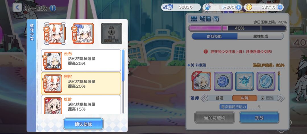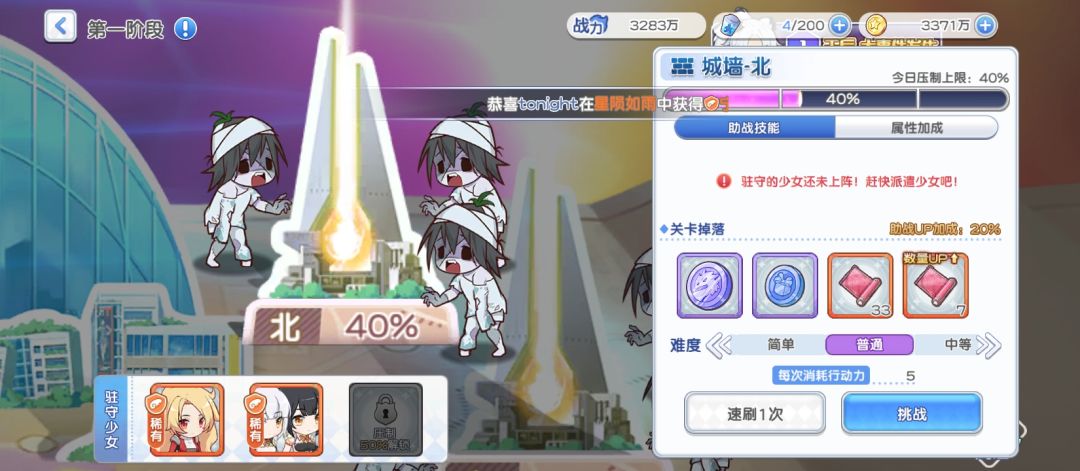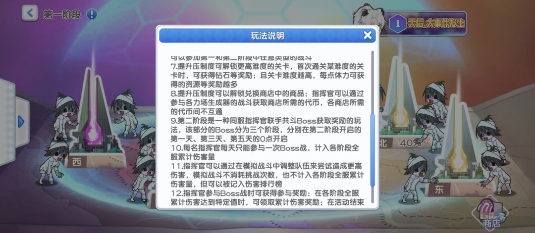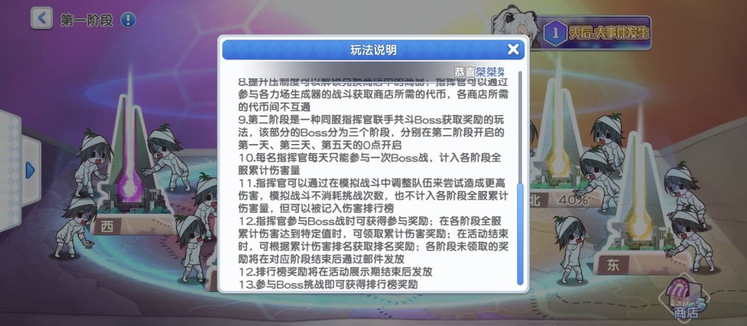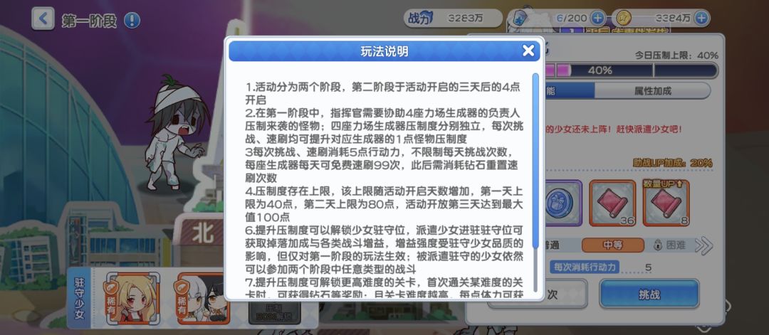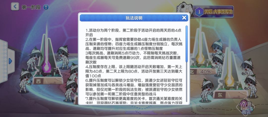 补:阶段一:活动前3天压制北、东、南、西四个副本。驻扎少女只对阶段一副本有增益且可以参与阶段一战斗。