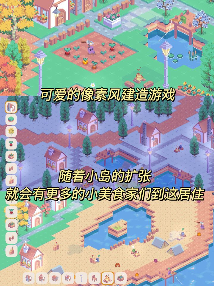 像素风的小人城市建设沙盒游戏,这游戏中我们只需要放置建筑物和风景🏜️,然后就会吸引无数来访的小美食家到达这里定居生活,种田、聊天、和世界互动。