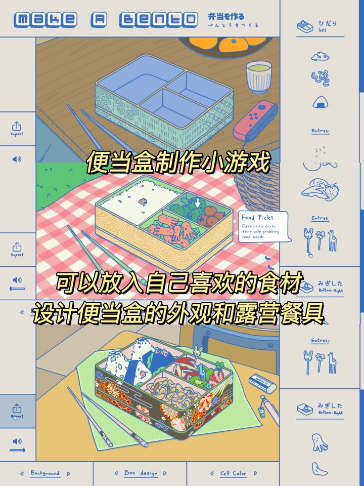 一款手绘画风的便当盒🍱装饰小游戏,可以自由放进喜欢的食材并且装饰便当盒的外观,背景板也可以随心更好,玩法很基础但是画风很治愈哦。