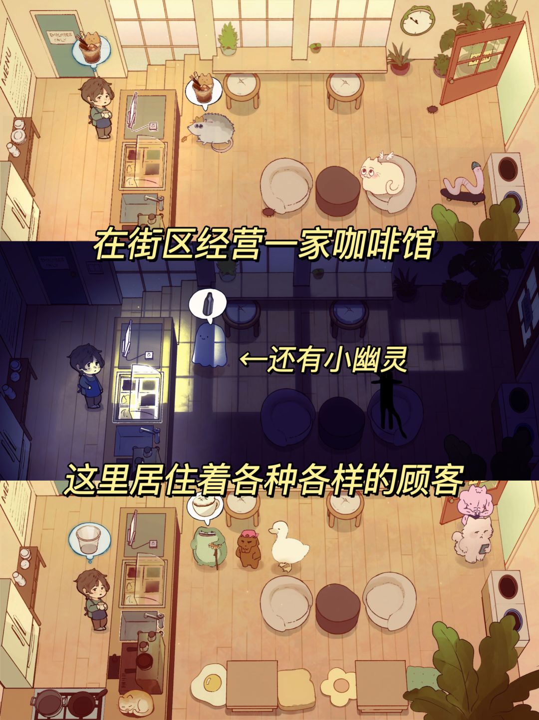 清新治愈的手绘风☕咖啡店经营小游戏,各种各样的生物排队到街区去购买你的🥤招牌饮料!但是当奇怪的顾客👻在夜里出现时,你能让咖啡馆开多久呢?