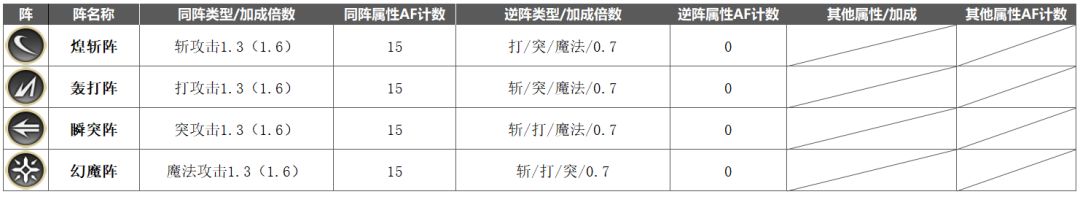 阵类似“领域”,开启后可以(增加/减少)不同种类攻击的伤害加成、改变AF条增长方式这2种效果,增减伤效果是对敌我均生效的;