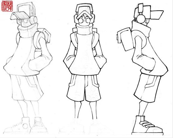 可爱、小正太的外形设定就有了,接下来是一些细节,考虑到钢穹都市中还是以科学技术为主的,因此在游戏中突然塞个“阿瓦啃大瓜”肯定不适合,于是手上抱着的书肯定就要换成科学知识的书。然后又考虑到得增加一些特点,于是想要给他增加一些潮流的元素,例如耳机,帽子,短裤等。