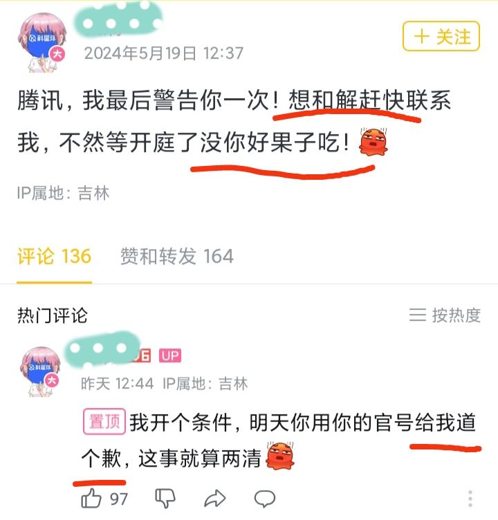 但是,一个月后的昨天5/19发布动态,警告腾讯赶紧和解,不然没好果子吃,并要求用官号向其道歉!