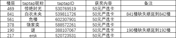恭喜以上幸运玩家中奖!辛苦各位玩家在七个工作日内添加联系方式QQ:565469107,添加时需要备注【TapTap+游戏名+活动简称】兑换奖品哦~(7个工作日内没有联系工作人员视为放弃奖励)