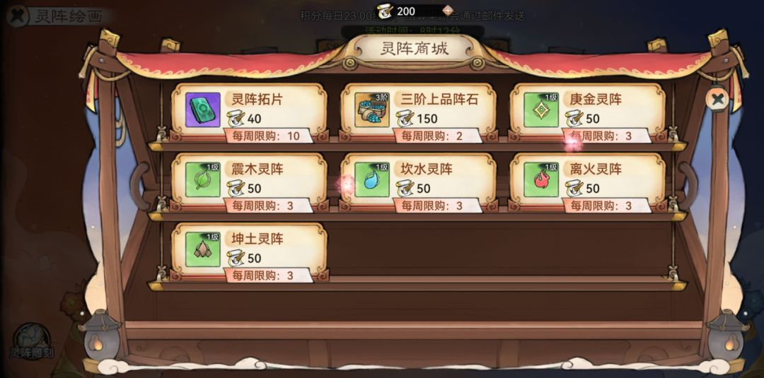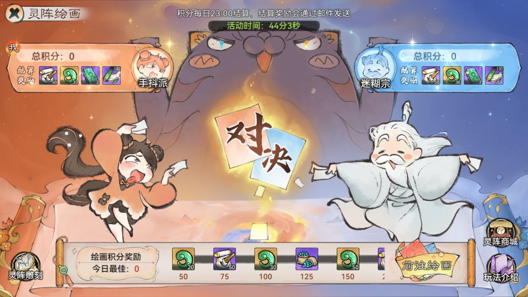 活动开启后,祖师获得的最高积分将会结算给阵营,当天晚上23点会根据双方阵营的总积分大小决定胜负,并派发阵营胜负奖励【绘画积分】。绘画积分可在【灵阵商铺】中兑换阵石、灵阵和灵阵拓片等道具。