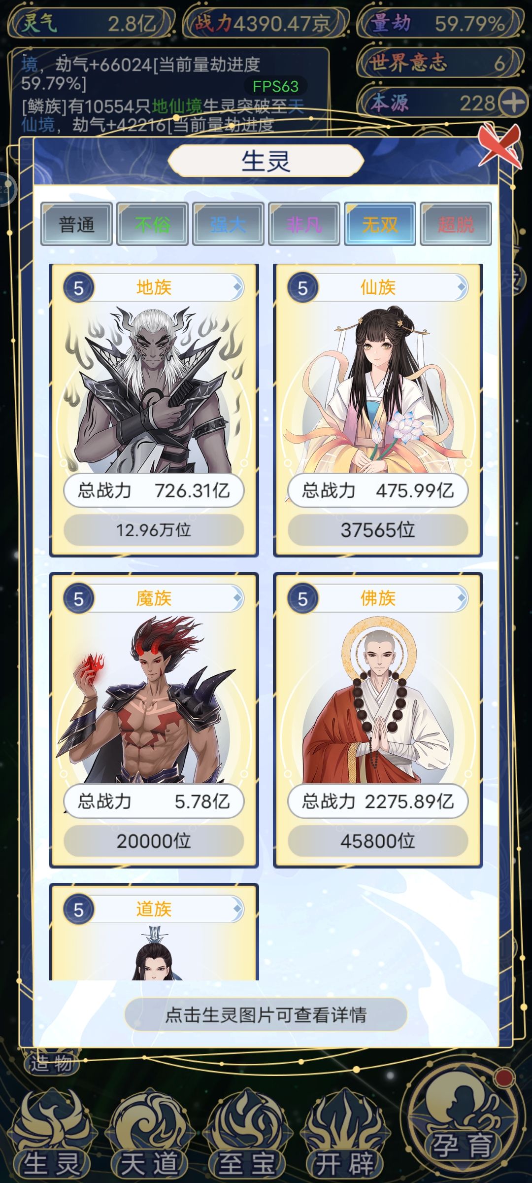 因为游戏前期缺少本源,所以优先选择本源或者福泽人族,每个种族24个强者上限,我尝试过如果刷满了就不会出现启示种族的选项了。
