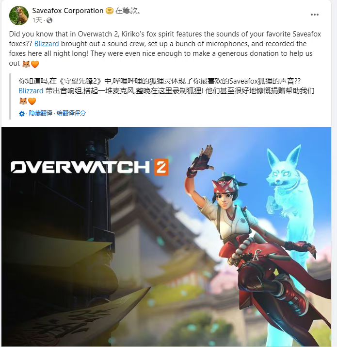 Saveafox Corporation表示,当初暴雪的工作人员带着音箱和麦克风等各种设备来到他们这家机构,并录了一整晚的狐狸叫声,临走的时候还慷慨地进行了捐赠帮助。