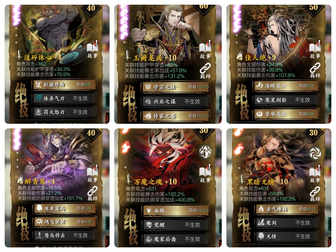 特别注意:七巧绮梦。其绝技一虽然为数值类绝技,但在游戏中实际为光环类效果,所以副卡不生效。(绝技一无法被宗师羽衣放大)