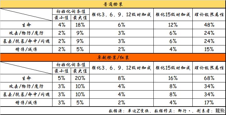 ,所以个人建议,当然只是个人瞎建议,还是那点,装备词缀下,按1%增伤等于4%攻击力算即可。准不准另说,且当玩笑话亦可。补个装备强化随机属性表