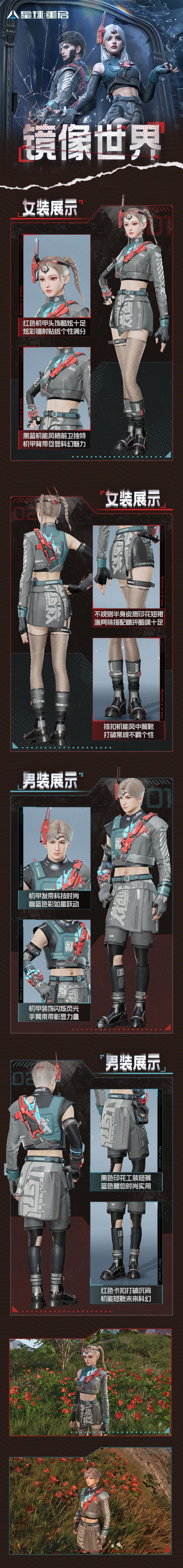 正义?邪恶?世界反转,镜中的你到底是谁?「镜像世界」时装包含上衣、裤子、手部、鞋子和头饰共五个部位,女款机甲风十足的工装背心搭配不规则短裙,展现了前卫独特的风格,充满科幻魅力;男款的黑色工装短裤搭配蓝色腰包,率性不羁,红色机甲发带则为整体造型注入了强烈的科技感。