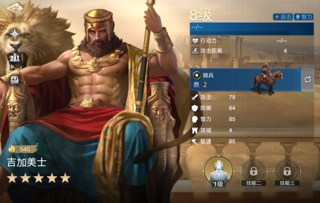 再来看一下吉加美士的技能,乍一看是非常普通的追击类技能,甚至不如一些四星的追击技能。但是其实是普通攻击后对敌方“两名”英雄造成智力伤害,可以理解为普攻后接一次AOE,如果换算下来伤害率其实有240%,比斯基泰女王还高出10%,而且吉加美士的属性比斯基泰女王还高不少,非常强力的追击技能。