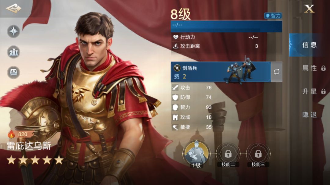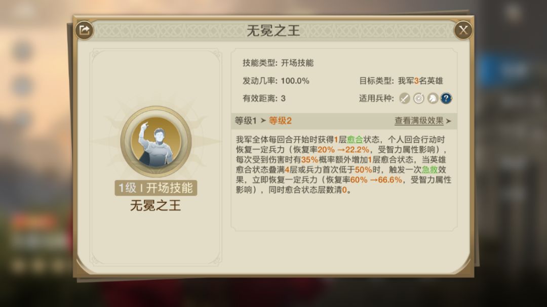 尤里乌斯的专属技能【无冕之王】:可以为队友提供愈合状态,不仅能让队友在战斗是持续回复兵力,还能在愈合状态叠到4层或者首次兵力下降到50%以下为队友提供急救效果,立即恢复大量兵力!
