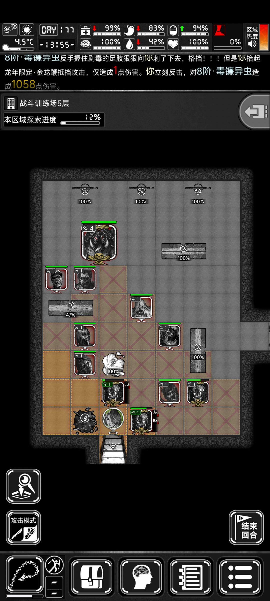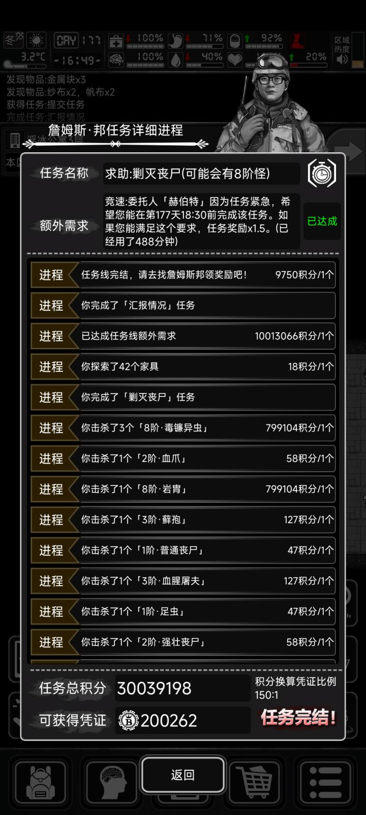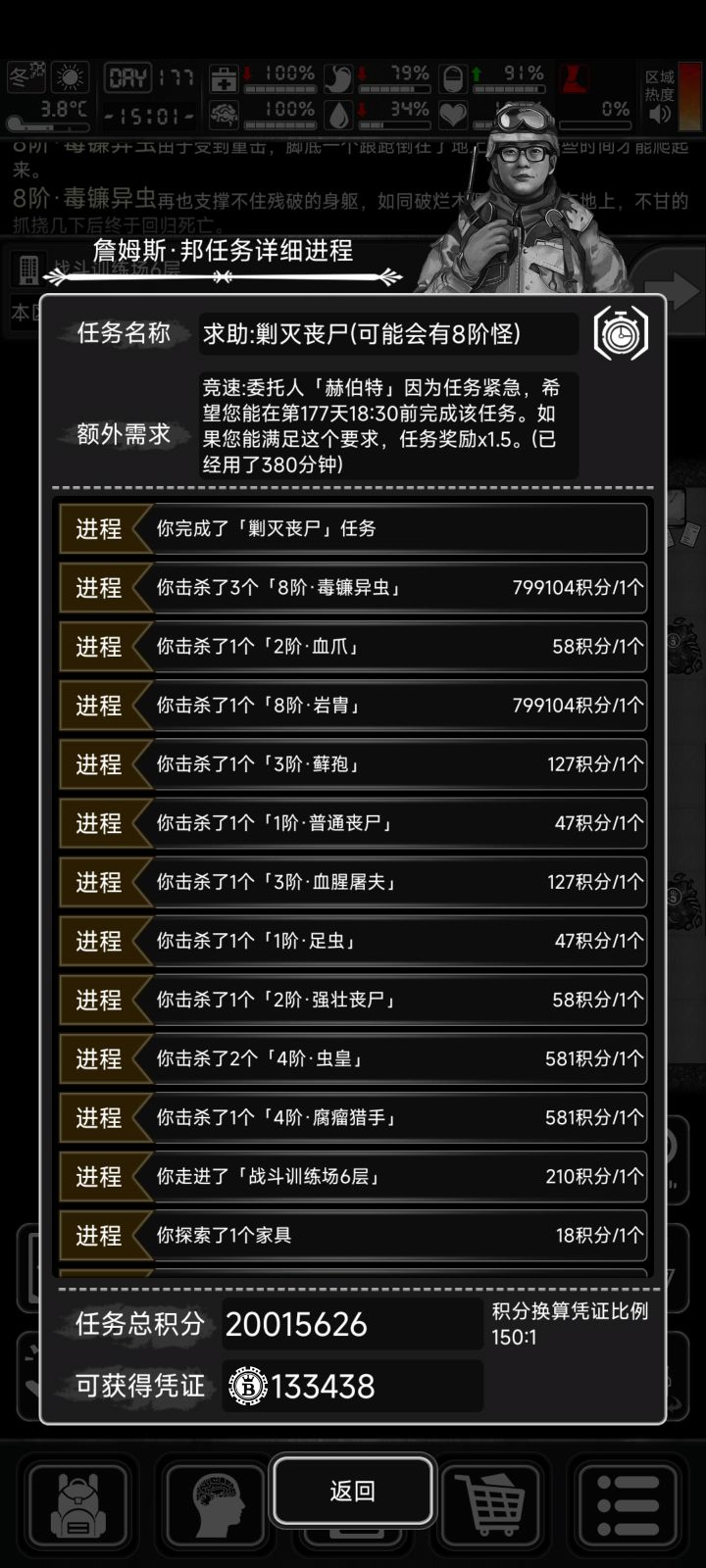 177天战旗8阶竞速剿灭丧尸任务,地点是6层的战斗训练场,大门1只,其余楼层分别sl出4只,这样总共是25只。带的两个龙鞭,一个龙高斯,6级维修盒20来个。肾上腺素5支,烟酒槟榔若干。期间贪金龙鞭法的伤害,被翻车虫击倒后再起不能,挂了两次,稳妥起见还是一直选择持盾鞭打姿势。血瓶流较为稳妥,但是竞速任务时间较赶,基本上来不及。所以采用龙鞭持盾流,虫子攻速较快,反击4-5次基本上就解决了。采用这个方法,做完剿灭任务后,距离竞速截止时间还有3小时左右,还有时间把两栋任务楼层的家具都搜了一遍。我觉得这个分数应该算是战旗任务的天花板了。