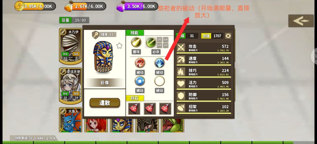 中排:本体角色带箭雨(群攻)箭雨装备有套装可加攻(流星火雨也行,不过我喜欢弓箭速度快) ,火女群体火球术(火女的必杀改技一定要四个的毕竟除了加火球数量还加攻)带上祭祀者的被动开场直接放大群体火球,巨像群体激光伤害还带减敌防御减敌攻击(带上祭祀者被动开场直接放大减攻减防)