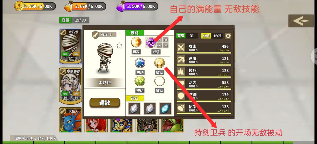 前排:木乃伊(唯一可双无敌的随从,融魂一个持剑卫兵的开场无敌被动 如上图)一人顶两人(任何前排建议都带个无敌被动)