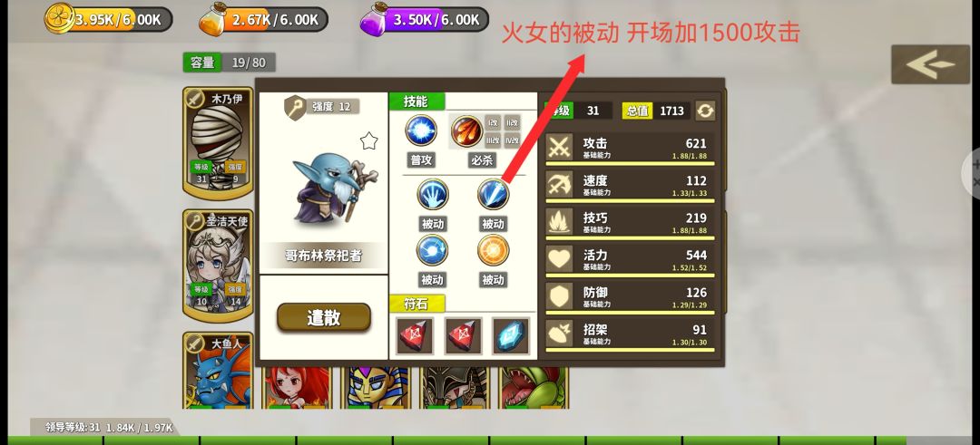 后排:两个哥布林祭祀者,有流星火雨加自己被动开场满能量直接放大(融魂一个火女的被动开场加1500攻的被动 如上图,伤害也很爆表)他的话前期可以用三个改技就行,三个和四个差距不大,不用太刻意。这套阵容太强了,爱不释手