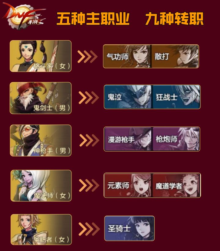 DNF共有5个主职业,角色升到10级后解锁转职,玩家可针对性发展和养成角色。转职后,技能树会更新转职后的对应技能,加点方面也更萌新友好,没有端游复杂,不同等级阶段系统会提供加点推荐,不用发愁啦!
