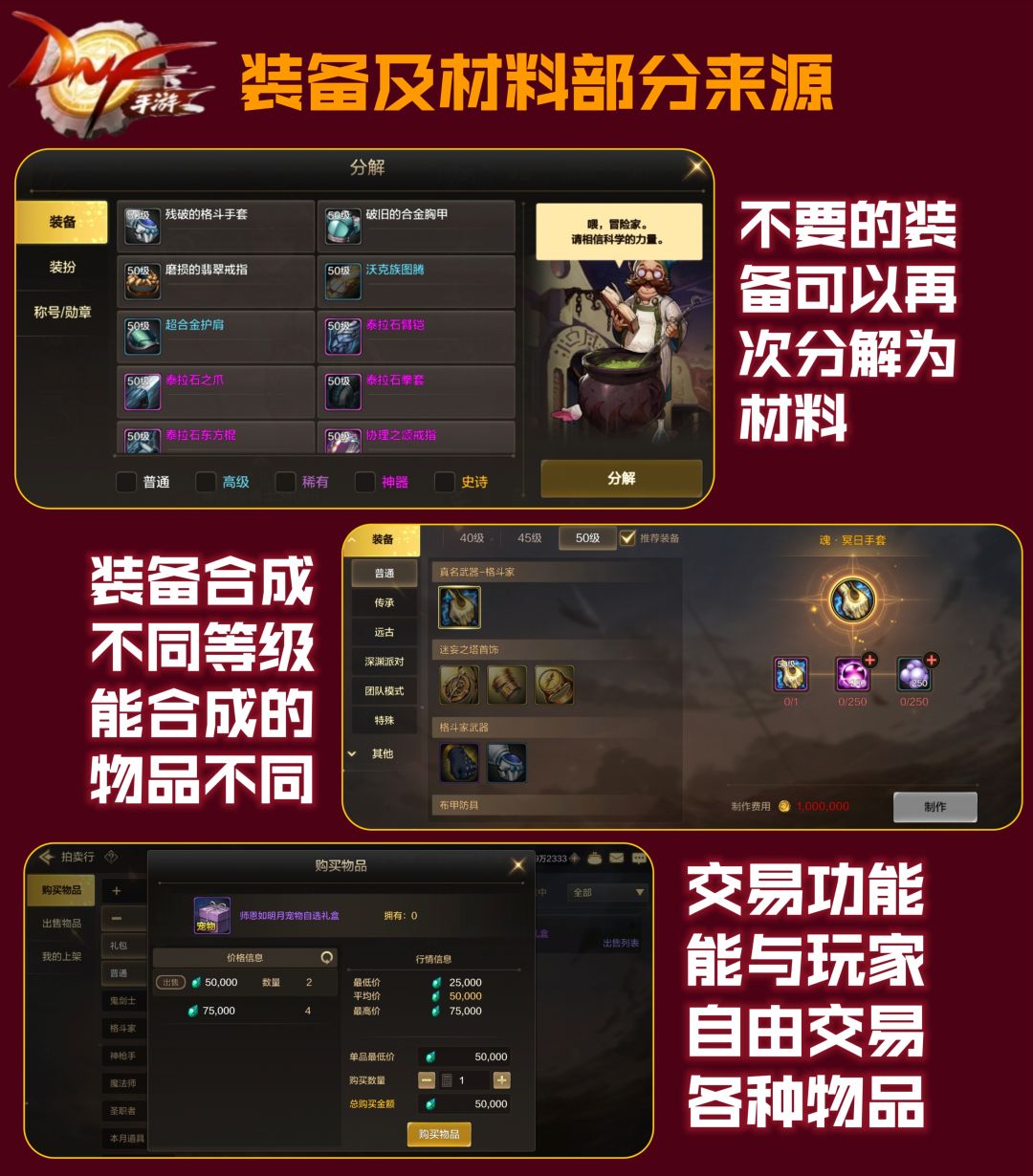 材料来源很广,自由度超高!!除了系统赠送和任务奖励外,刷图会爆稀有物件和装备材料,用不上的装备还可以分解,如果还缺的话,不妨去交易市场看看有没有其他玩家出售吧!手游也能自由交易~