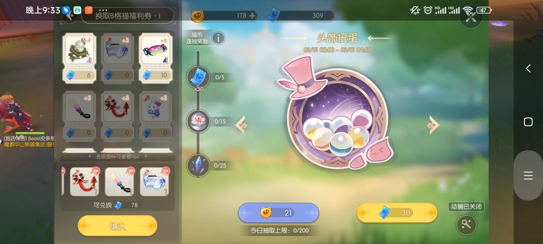 头饰扭蛋机每个月会重置一次,月卡用户可以免费三次,非月卡用户是1次