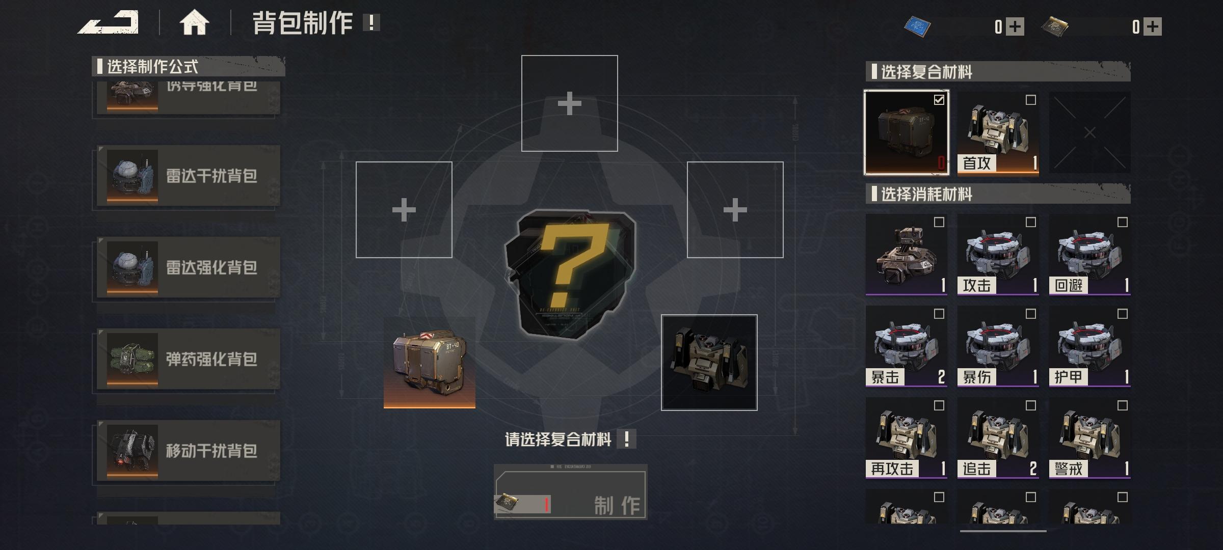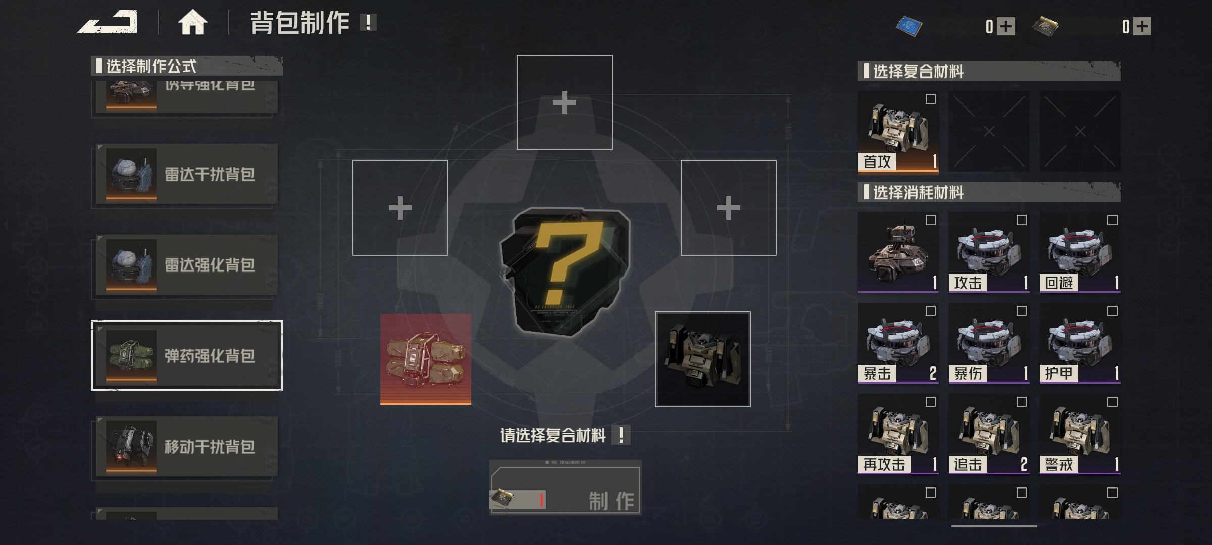 升级后看到这个高级背包制作功能,我第一个想到的是给战术机的出力背包增加弹药功能。然后等我兴冲冲看了一遍,发现所有的二级背包都只能选择增强或者干扰两条路,不能选择弹药包。瞬间觉得不香了