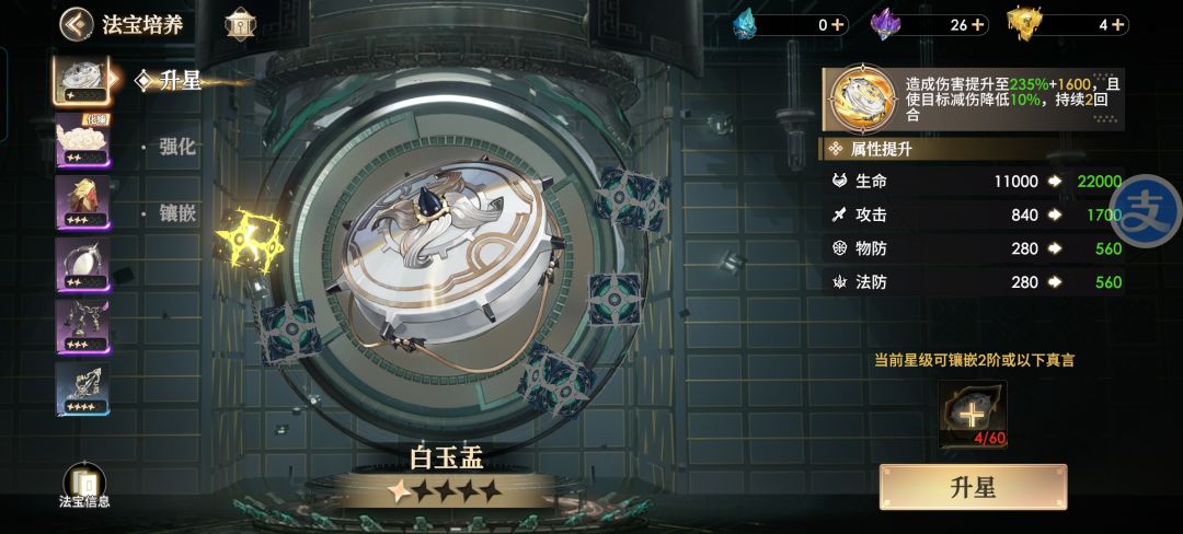 白玉盂 作为后排杀手的法宝,配合李白有着及其亮眼的表现,前期由于李白输出容易带走对方后排挂件,导致白玉盂的输出没有表现出来。我们看下五星的效果,攻击对方后排,造成265%的倍率伤害,同时降低对方16%的减伤持续两回合,且目标生命值高于50的情况下,造成的伤害提升100%,后期队伍坦度上来后,李白攻击后排很难压低血线,这个时候白玉盂可以更好地打出双倍伤害,并且降低免伤也是增加己方输出的一种手段,暴力输出队可以优先升星,获取难度低,可以商店购买碎片慢慢培养。推荐阵容:李白,杜甫,太平,猴子,猪八戒,嫦娥。