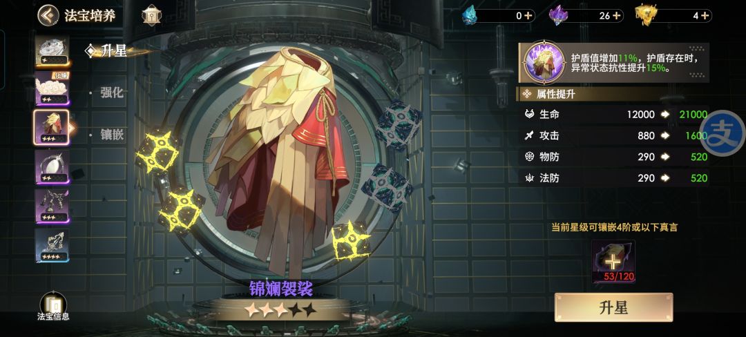 锦斓袈裟 首冲获得的法宝,强度可以,不管是输出队还是肉队,都可以佩戴,满星给群体增加上阵人物平均生命值13%的护盾值之外,护盾存在期间还提供20的异常抗性且免疫控制。前期就很实用,而且越到后面效果越明显,毕竟前期队伍有主c之分,等后期资源平等的状况下,袈裟有着更好的保护作用,另外配合盾天王,有着更出色的保护能力。适合坦队和持续输出的队伍,推荐阵容:火队陈奇,红孩儿,九头虫,乌巢禅师,罗刹,黄狮精或者老鼠精或多闻天王,增长天王,猴子,猪八戒,老鼠精加黄狮精(双减伤buff)。