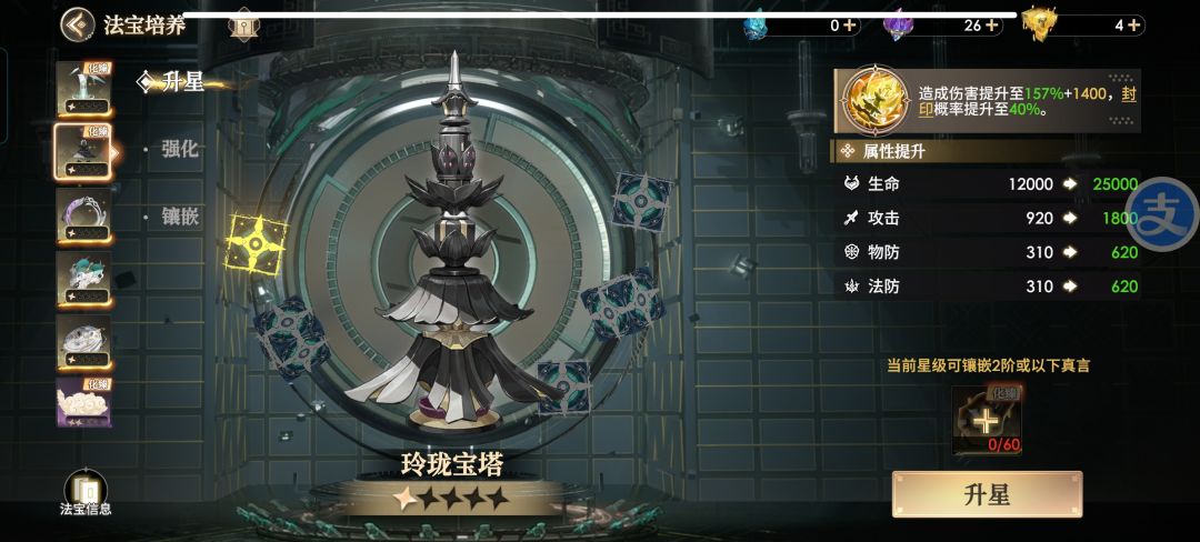 玲珑宝塔(强力推荐) 同样作为化臻法宝,玲珑宝塔拥有的是强力的控制以及辅助输出的能力,作为目前游戏唯一的封印特效法宝,五星宝塔更是拥有百分百的封印概率。封印:封印地方能量最高的一个目标,目标无法行动无法被攻击,封印解除时,受到封印期间友方总承伤10%的额外伤害。宝塔可以很好的针对对方的主c,特别像猴子这种回能不快的,一回合动不了简直要了半条命。推荐阵容:地藏王,孟婆,猴子,猪八戒,李白,杜甫。平民阵容,宝塔的优先级不如杨柳净瓶,可以先开图鉴上真言加战力,两个化臻法宝都是越后期越强的存在,还是那句话,拍卖只要手快,你也可以体会大佬的乐趣!