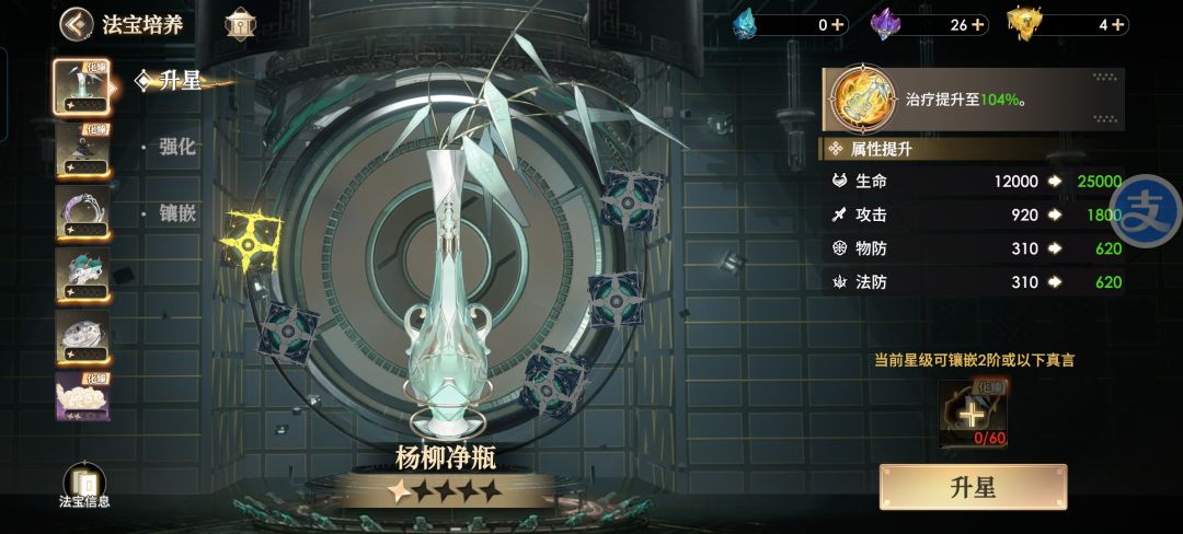 2.杨柳净瓶(强力推荐) 说到后期强力法宝,那不得不提作为化臻法宝之一的杨柳净瓶,目前唯一群体回血法宝,更值得一提的是,三星开始可以复活第一个败退的队友,且可以随机清除2个异常状态的强大能力,五星复活队友的同时还能回复2点灵能,后期必备的强力法宝,氪佬强推。平民只能靠拍卖行慢慢攒了,只要你手速快,你也可以当大佬!目前推荐阵容:地藏王,孟婆,猴子,猪八戒,李白,杜甫。众所周知,地藏王的群攻倍率是480%并且效果是伤害均摊,所以地方只要有减员,地藏王对单体的伤害就越高,直到剩余一人时候的单体480%的‘群攻’。所以有杨柳净瓶的奶量和复活保护,可以让对方地藏王的强势期大大延后,对于平民阵容来说可以搭配金童玉女或者嫦娥来使用,金童,嫦娥的群奶和buff加成配合杨柳的双奶相得益彰。
