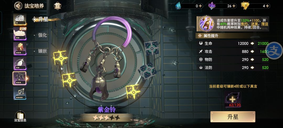 紫金铃 也是第一天就送的法宝,满星拥有132%群攻倍率的伤害,主要的作用是上debuff,其中有焦灼debuff,契合火队,但是目前火队缺少大c,不是主流,目前不推荐使用,可以过渡升星拉战力,暂时没有上场的必要。如果特别喜欢火队的小伙伴,可以优先提升,建议阵容(陈奇,红孩儿,九头虫,乌巢禅师,罗刹,黄狮精或者老鼠精)