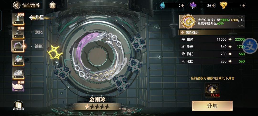 金刚镯(强力推荐) 前期就可以从拍卖行买到的强力输出兼控制的法宝,满星拥有者5次270%倍率的单体伤害以及重复攻击同一目标时,拥有70%的眩晕概率。三星时效果就比较明显了。建议放在法宝的2.3号位,因为开局使对方减员的几率小,金刚镯造成的伤害较为分散,人越少,金刚镯眩晕的几率越大,残局神级法宝,建议入手。推荐阵容:猴子,猪八戒,李白,杜甫,太平,嫦娥。