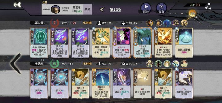 无语了,差了一点灵气,护体丹卡了一动,气死我啦!复盘试了一下,再给我一张暗香就赢了。心好累,前面奔着碎击去的(元婴一张碎击都没有,聚灵丹也没有)上化神才出碎击(碎击流的牌都炼了...),无奈改丹木又没有聚灵丹(还好留了丹木牌,不然我真的裂开了)