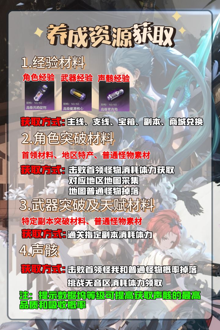 以上是我个人对鸣潮公测前期养成资源的获取与分配做的一些总结,希望对大家有所帮助,如有遗漏欢迎补充!![[表情_致敬]](https://img-tc.tapimg.com/market/images/fc1787cfdb43044c70533912ec2b76be.png)