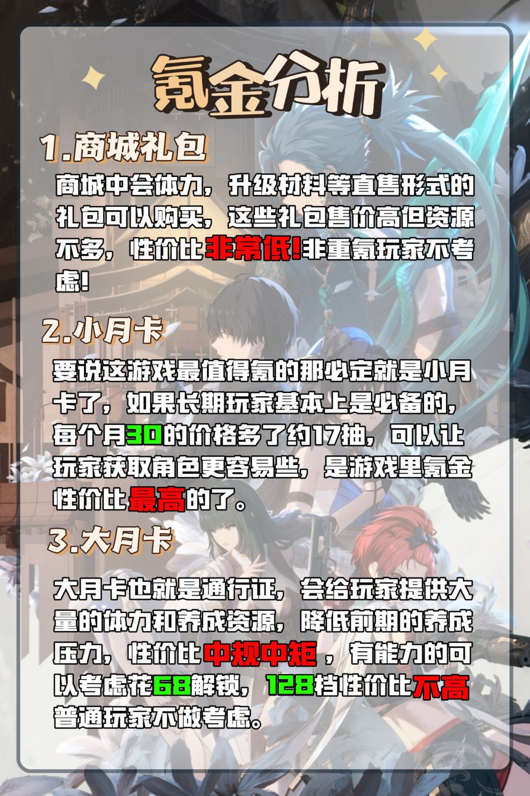3.大月卡:大月卡也就是通行证,大月卡会给玩家提供大量的体力和养成资源,降低前期的养成压力。有能力的可以考虑花68元解锁,128元性价比不高,非重氪不考虑。