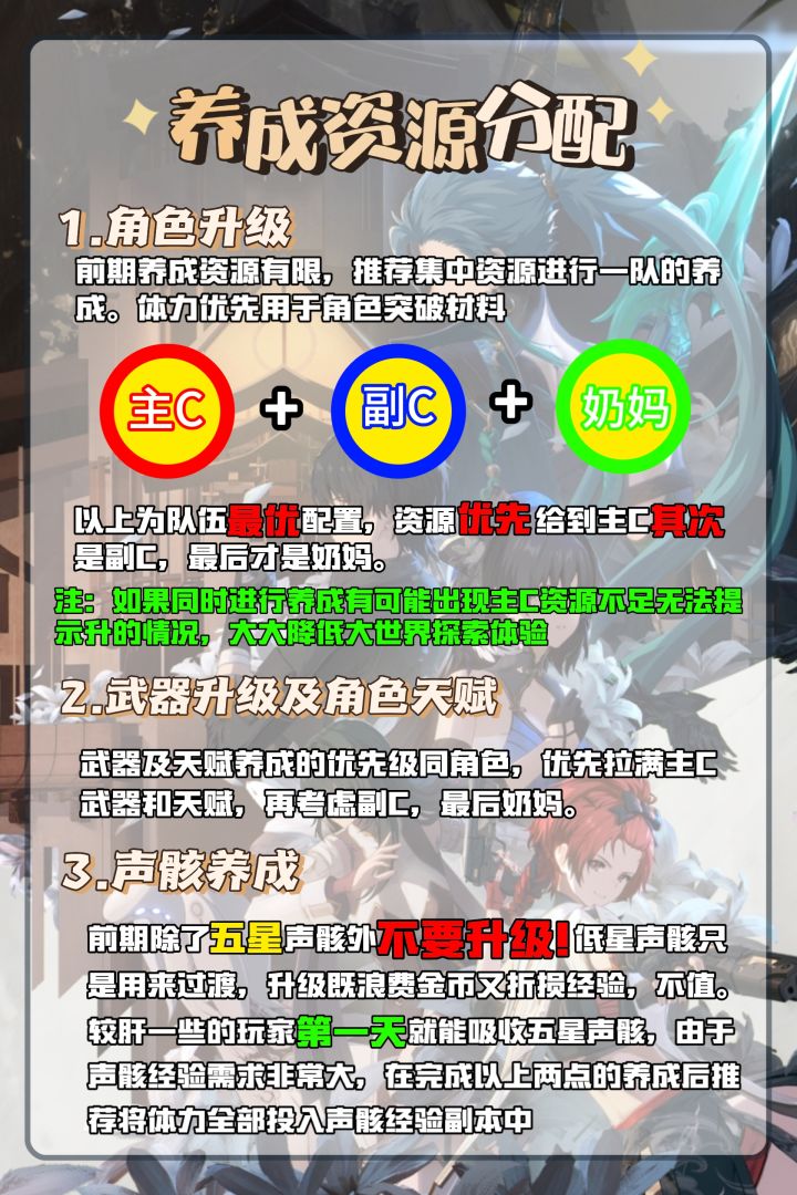 1.角色升级:前期养成资源比较紧张所以推荐优先集中资源进行一队的养成,体力优先用于角色突破材料。队伍最优配置为 [主C+副C+奶妈] 养成优先级主C>副C>奶妈。优先将主C等级拉起来再拉副C和辅助,如果同时进行有可能出现主C资源不足无法提升大大降低大世界探索体验。