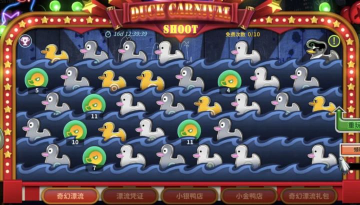 如果进新场打到的第一个金鸭是200、180并且10次免费次数已用完,就可以换漂流场。