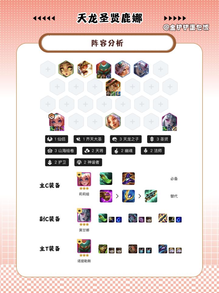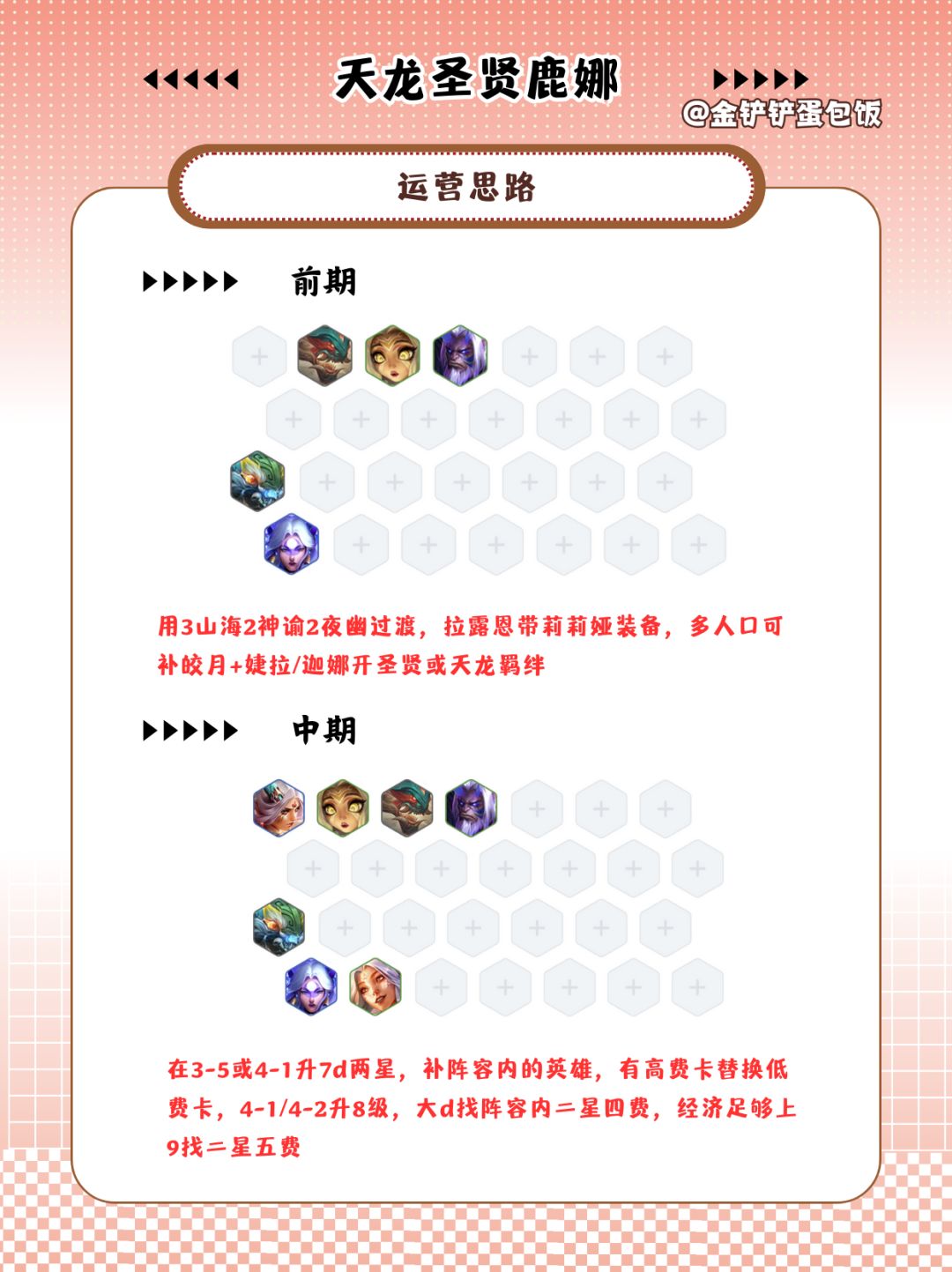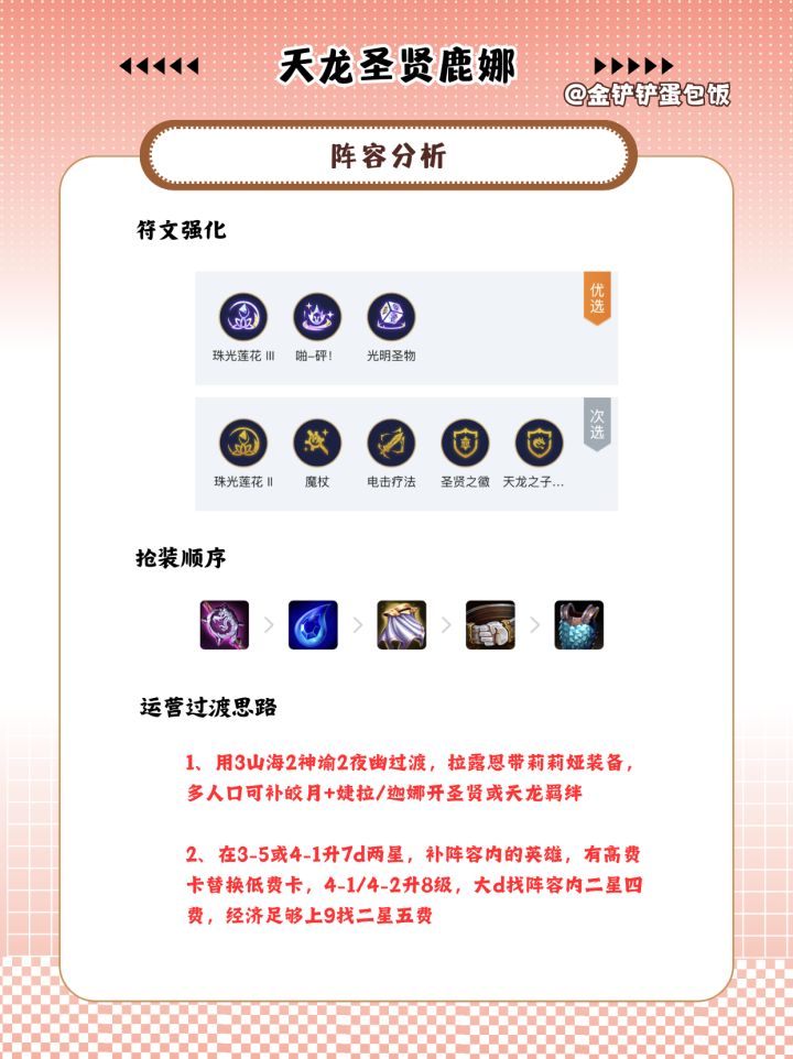 1、用3山海2神谕2夜幽过渡,拉露恩带莉莉娅装备,多人口可补皎月+婕拉/迦娜开圣贤或天龙羁绊