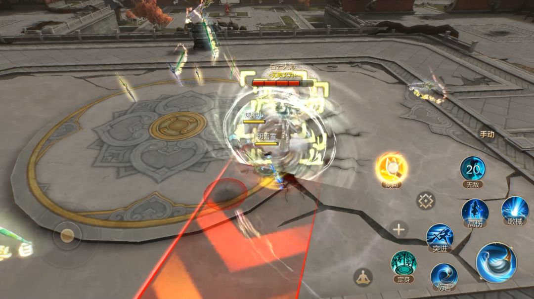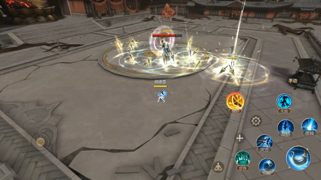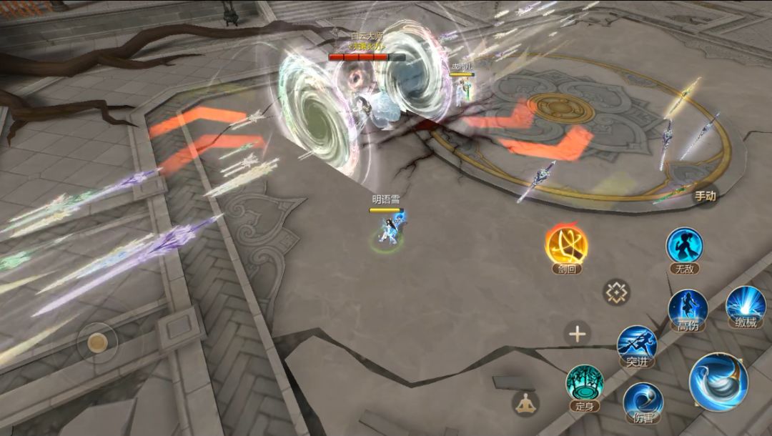 应对方法:站在卍字剑来的空隙处,当剑落下后使用剑回技能,即可将落地的剑通过剑回术打到白云大师身上,如果飞天期间受到剑回伤害可以积攒飞天破防,攒满之后白云大师进入破防并落地,此时就是最好的输出时机了!